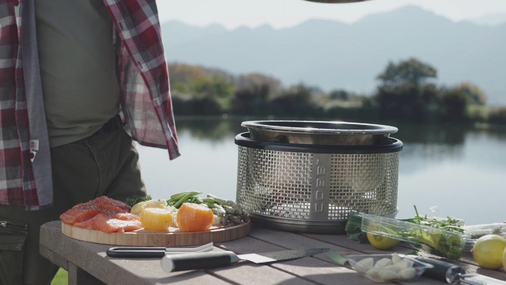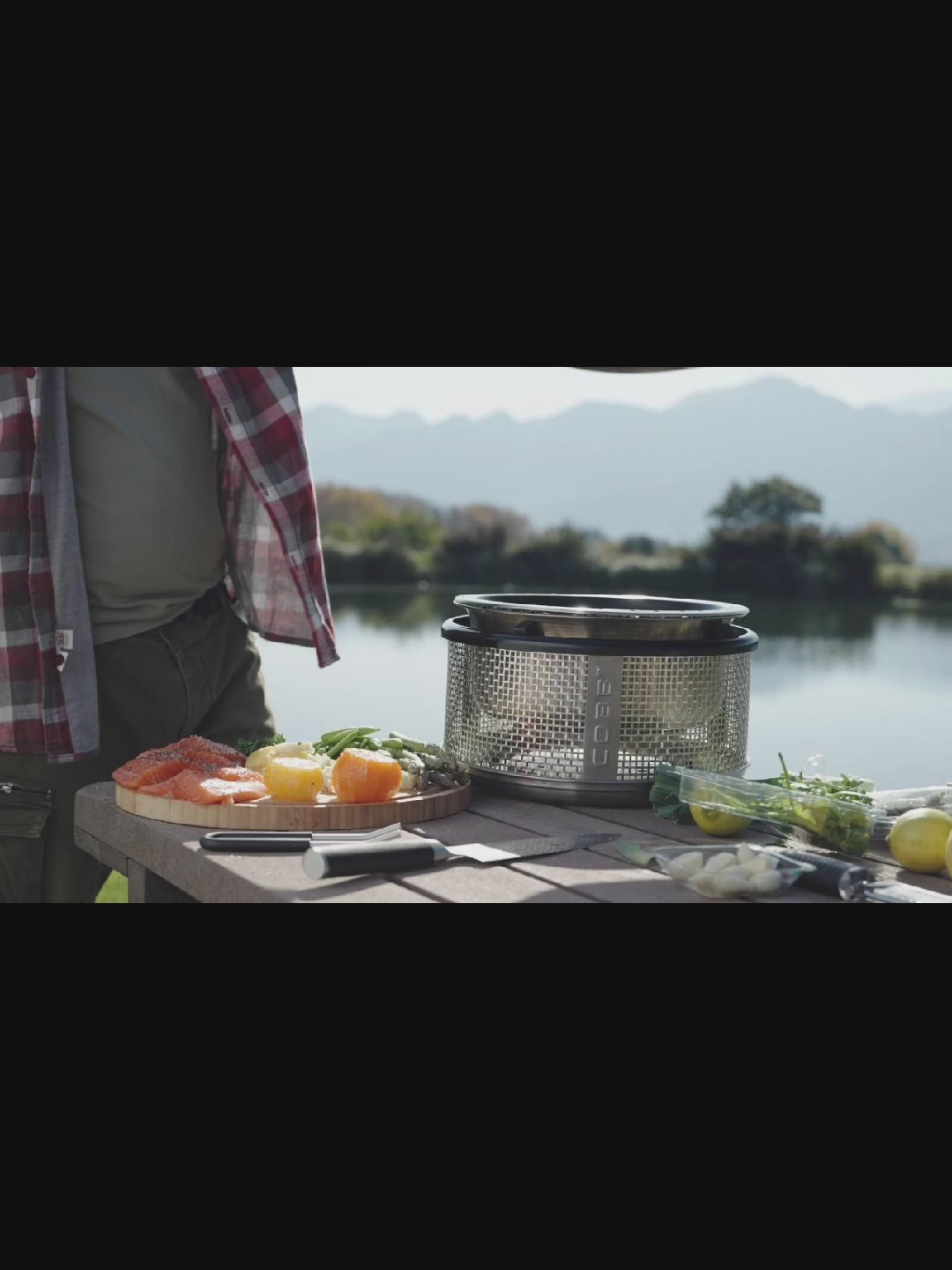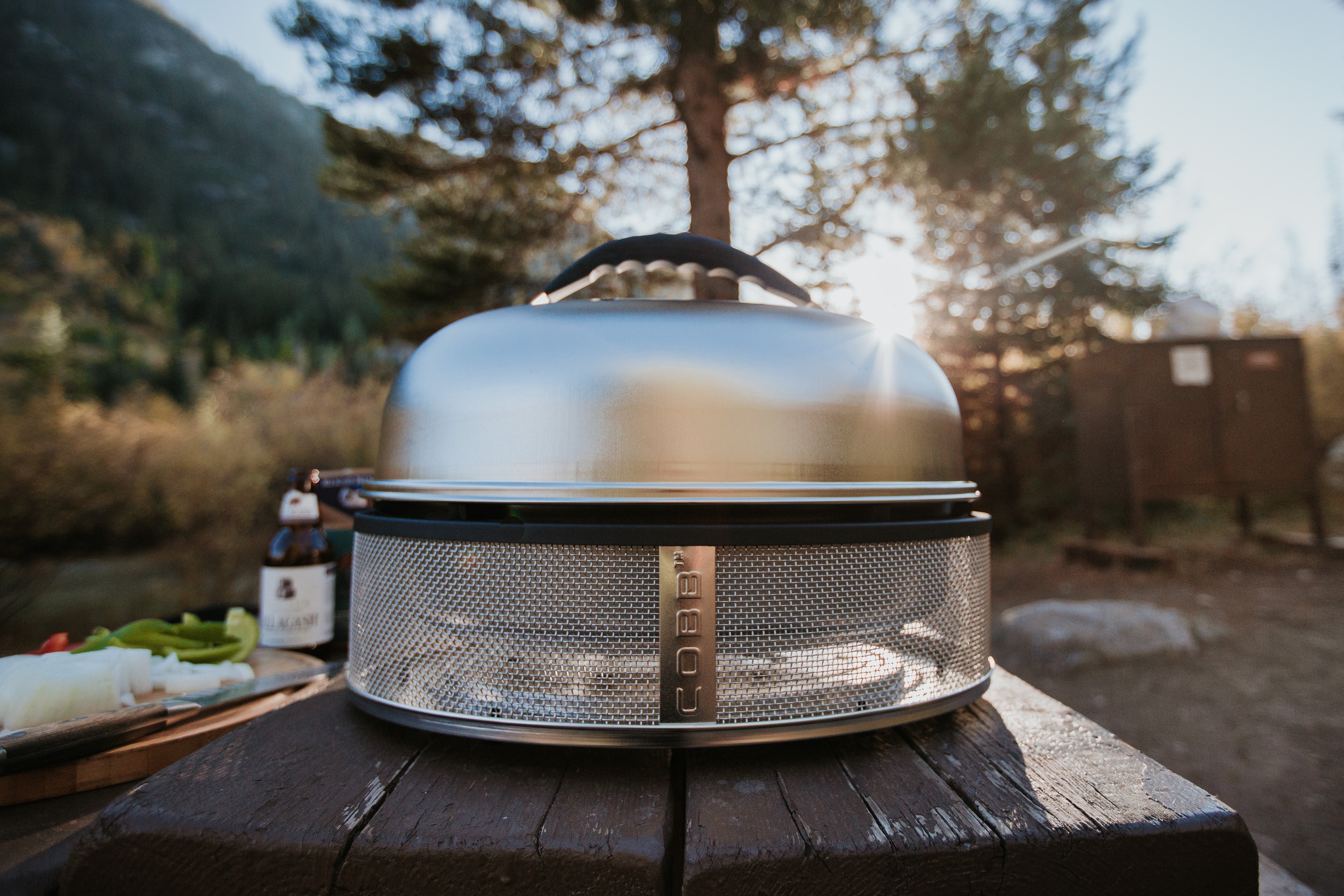 COBB Premier (+plus) con base estilo reja de acero inoxidable, parrilla grill y rack para rostizar